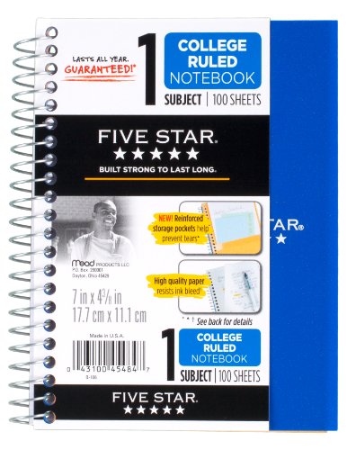 Five Star Spiral Notebook, College Ruled, 1 Subject, 4.38 x 7 Inches, 100 Sheets, Assorted Colors (45484) (Product Details and Features)